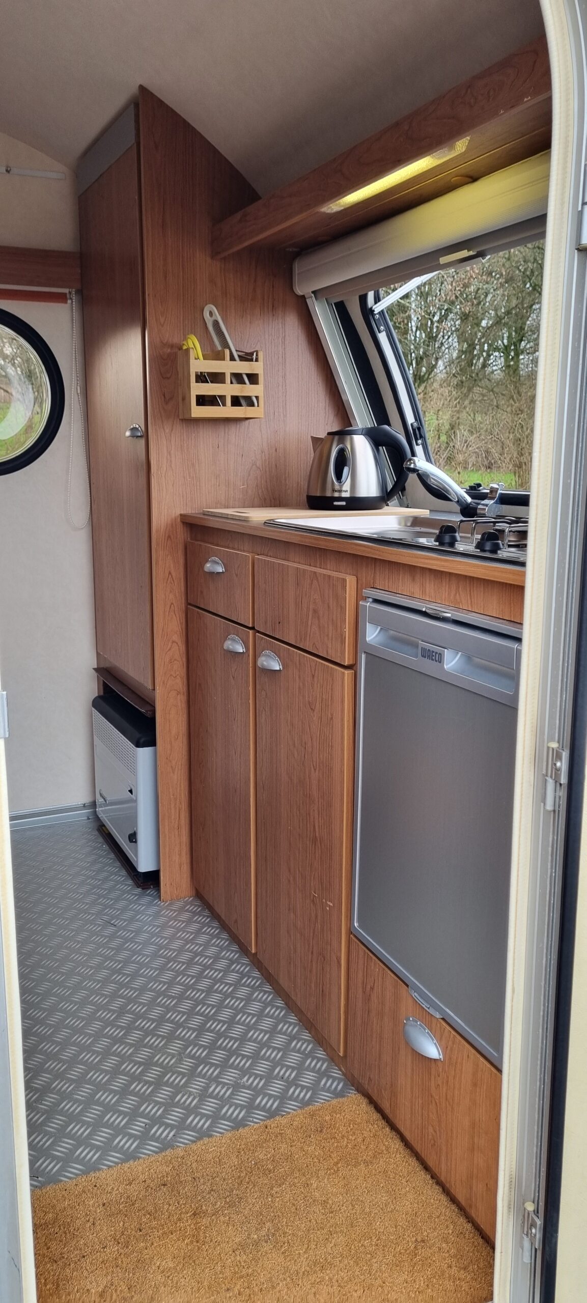 De caravan beschikt over een losse vers watertank van 25 liter, een koelkast en een 2 pits gasstel.