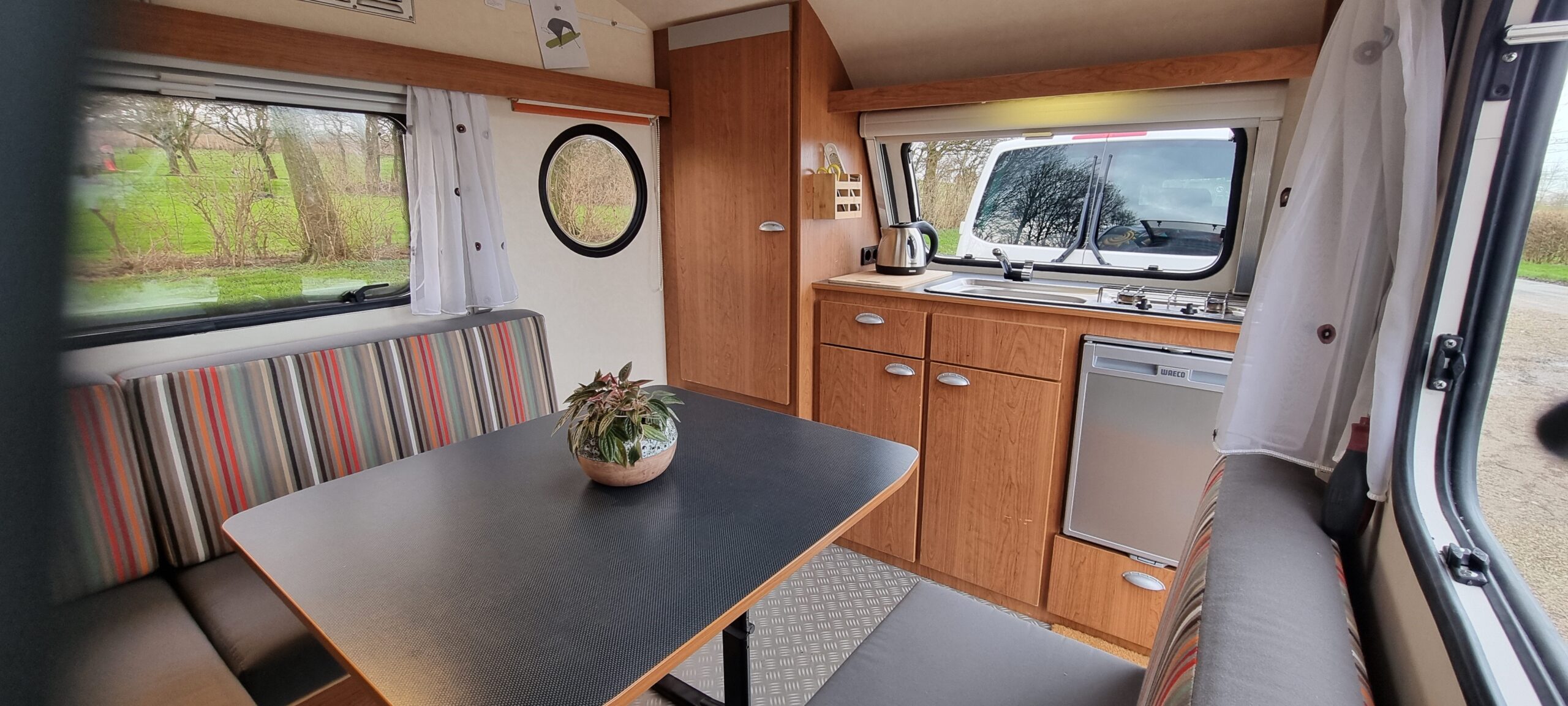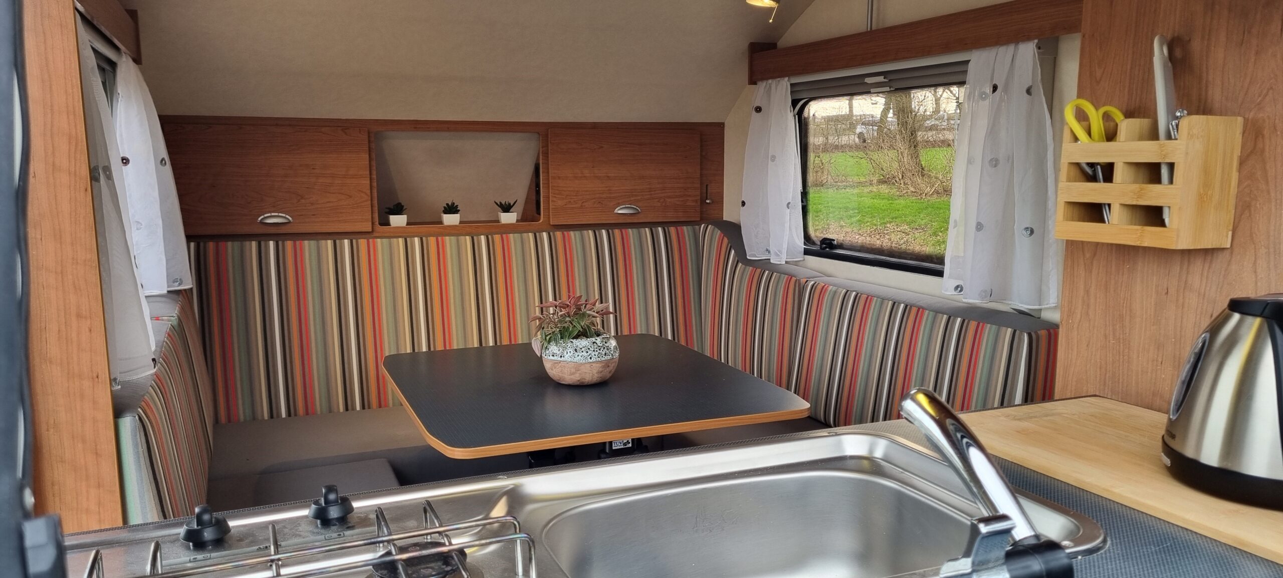 De T@B is licht zodat u hem dus eenvoudig op zijn plaats kunt manoeuvreren, nadat u dit heeft gedaan kunt u de bijgeleverde luifel er e.v.t. aanzetten. In de keuken vindt u een compleet servies met pannen en keukengerei.